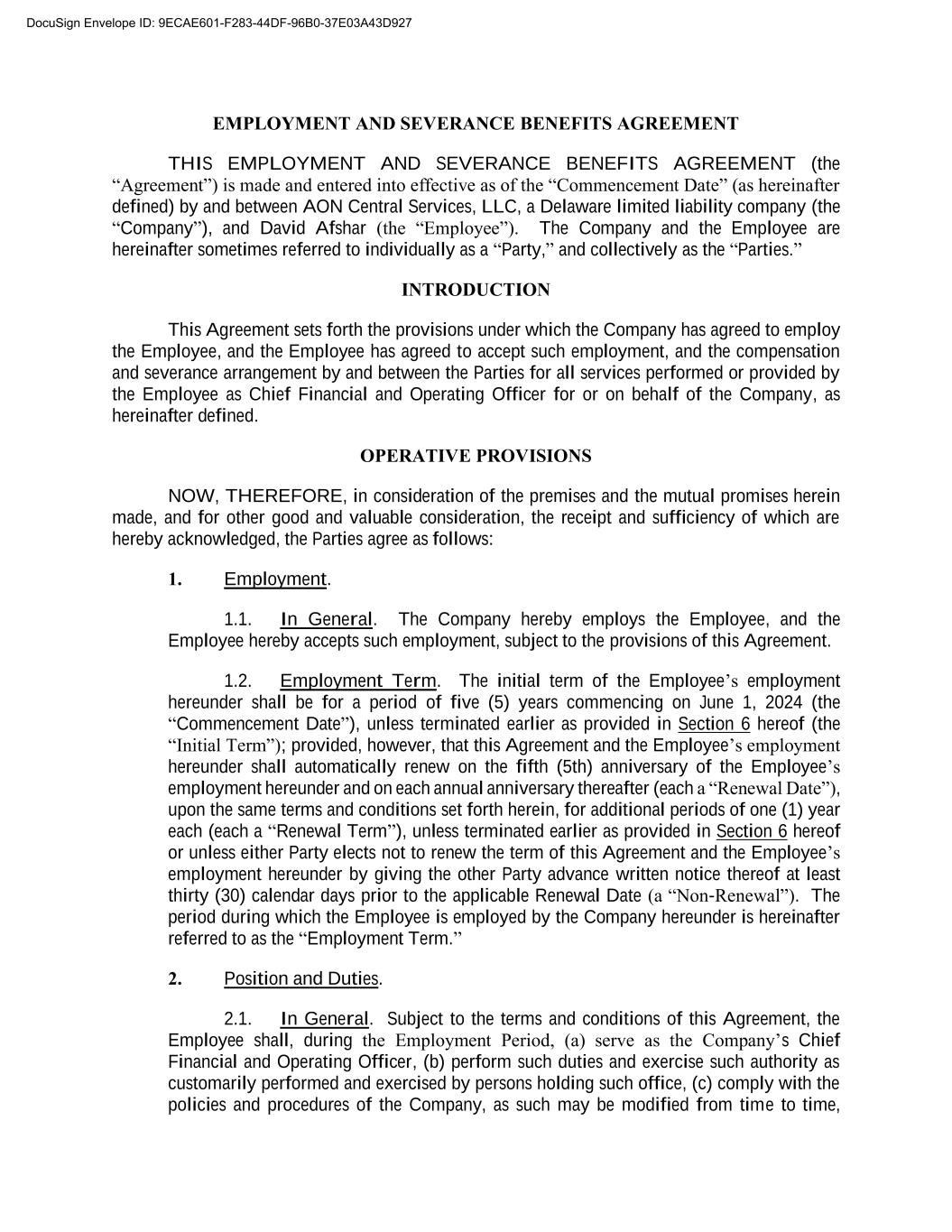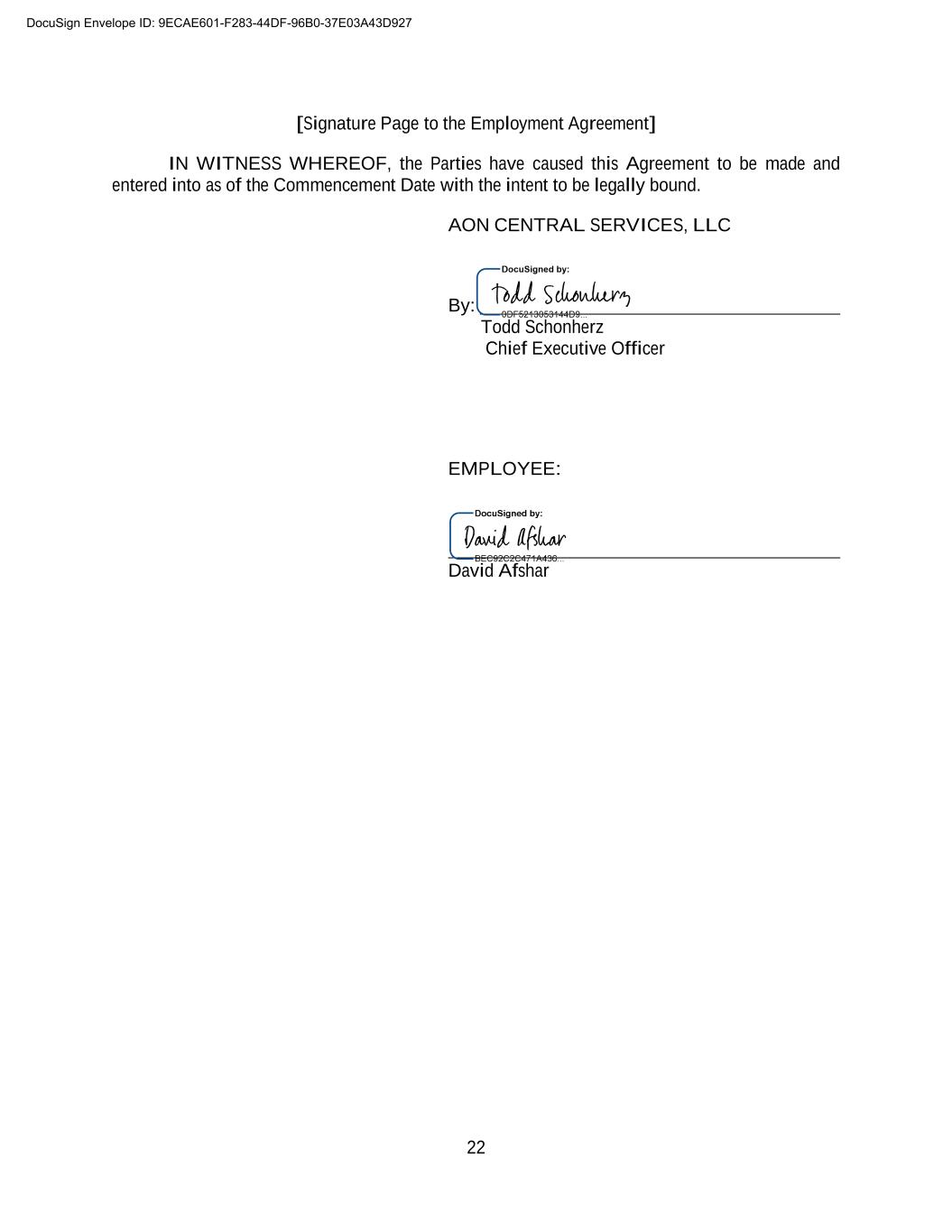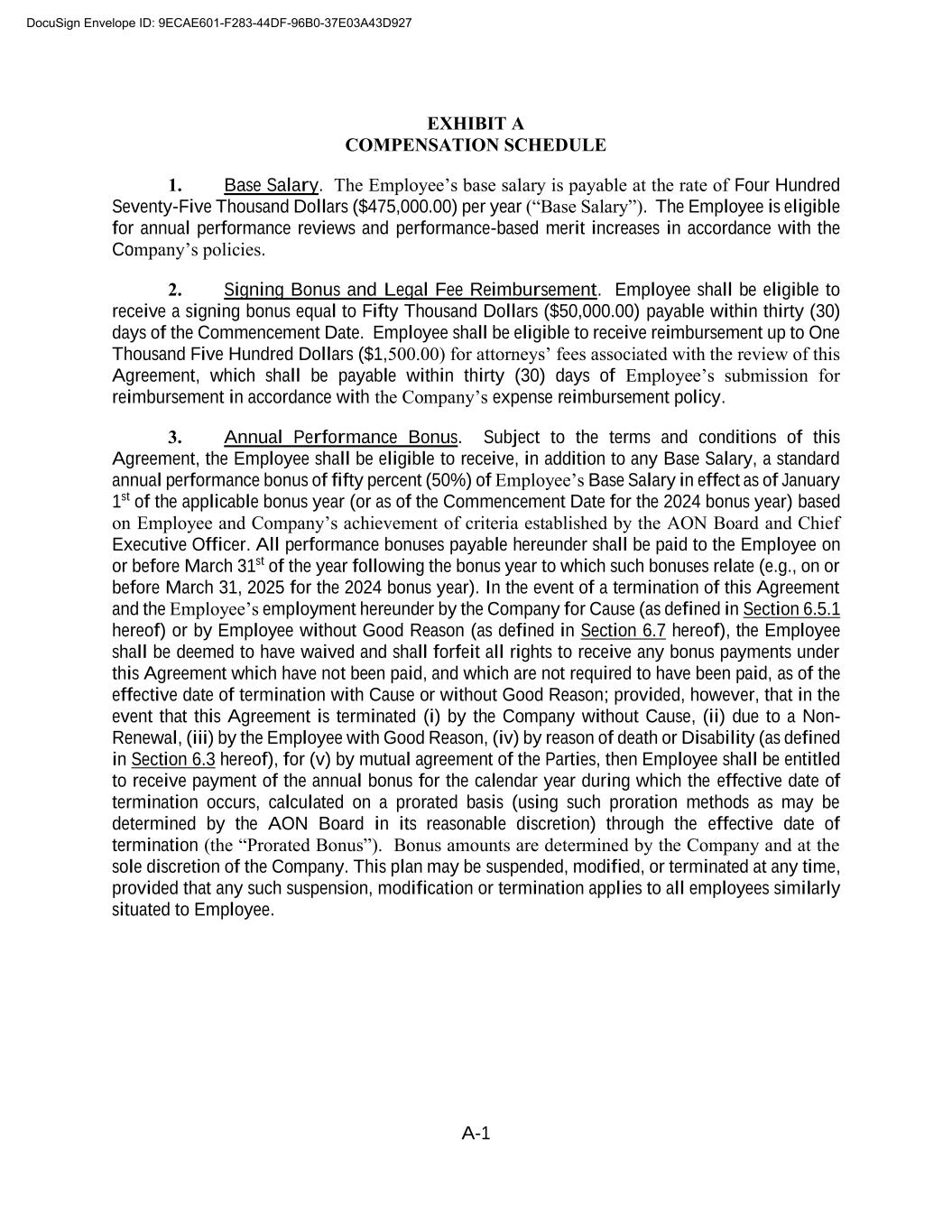 A-1 EXHIBIT A COMPENSATION SCHEDULE 1. Base Salary. The Employee’s base salary is payable at the rate of Four Hundred Seventy-Five Thousand Dollars ($475,000.00) per year (“Base Salary”). The Employee is eligible for annual performance reviews and performance-based merit increases in accordance with the Company’s policies. 2. Signing Bonus and Legal Fee Reimbursement. Employee shall be eligible to receive a signing bonus equal to Fifty Thousand Dollars ($50,000.00) payable within thirty (30) days of the Commencement Date. Employee shall be eligible to receive reimbursement up to One Thousand Five Hundred Dollars ($1,500.00) for attorneys’ fees associated with the review of this Agreement, which shall be payable within thirty (30) days of Employee’s submission for reimbursement in accordance with the Company’s expense reimbursement policy. 3. Annual Performance Bonus. Subject to the terms and conditions of this Agreement, the Employee shall be eligible to receive, in addition to any Base Salary, a standard annual performance bonus of fifty percent (50%) of Employee’s Base Salary in effect as of January 1st of the applicable bonus year (or as of the Commencement Date for the 2024 bonus year) based on Employee and Company’s achievement of criteria established by the AON Board and Chief Executive Officer. All performance bonuses payable hereunder shall be paid to the Employee on or before March 31st of the year following the bonus year to which such bonuses relate (e.g., on or before March 31, 2025 for the 2024 bonus year). In the event of a termination of this Agreement and the Employee’s employment hereunder by the Company for Cause (as defined in Section 6.5.1 hereof) or by Employee without Good Reason (as defined in Section 6.7 hereof), the Employee shall be deemed to have waived and shall forfeit all rights to receive any bonus payments under this Agreement which have not been paid, and which are not required to have been paid, as of the effective date of termination with Cause or without Good Reason; provided, however, that in the event that this Agreement is terminated (i) by the Company without Cause, (ii) due to a Non- Renewal, (iii) by the Employee with Good Reason, (iv) by reason of death or Disability (as defined in Section 6.3 hereof), for (v) by mutual agreement of the Parties, then Employee shall be entitled to receive payment of the annual bonus for the calendar year during which the effective date of termination occurs, calculated on a prorated basis (using such proration methods as may be determined by the AON Board in its reasonable discretion) through the effective date of termination (the “Prorated Bonus”). Bonus amounts are determined by the Company and at the sole discretion of the Company. This plan may be suspended, modified, or terminated at any time, provided that any such suspension, modification or termination applies to all employees similarly situated to Employee. DocuSign Envelope ID: 9ECAE601-F283-44DF-96B0-37E03A43D927