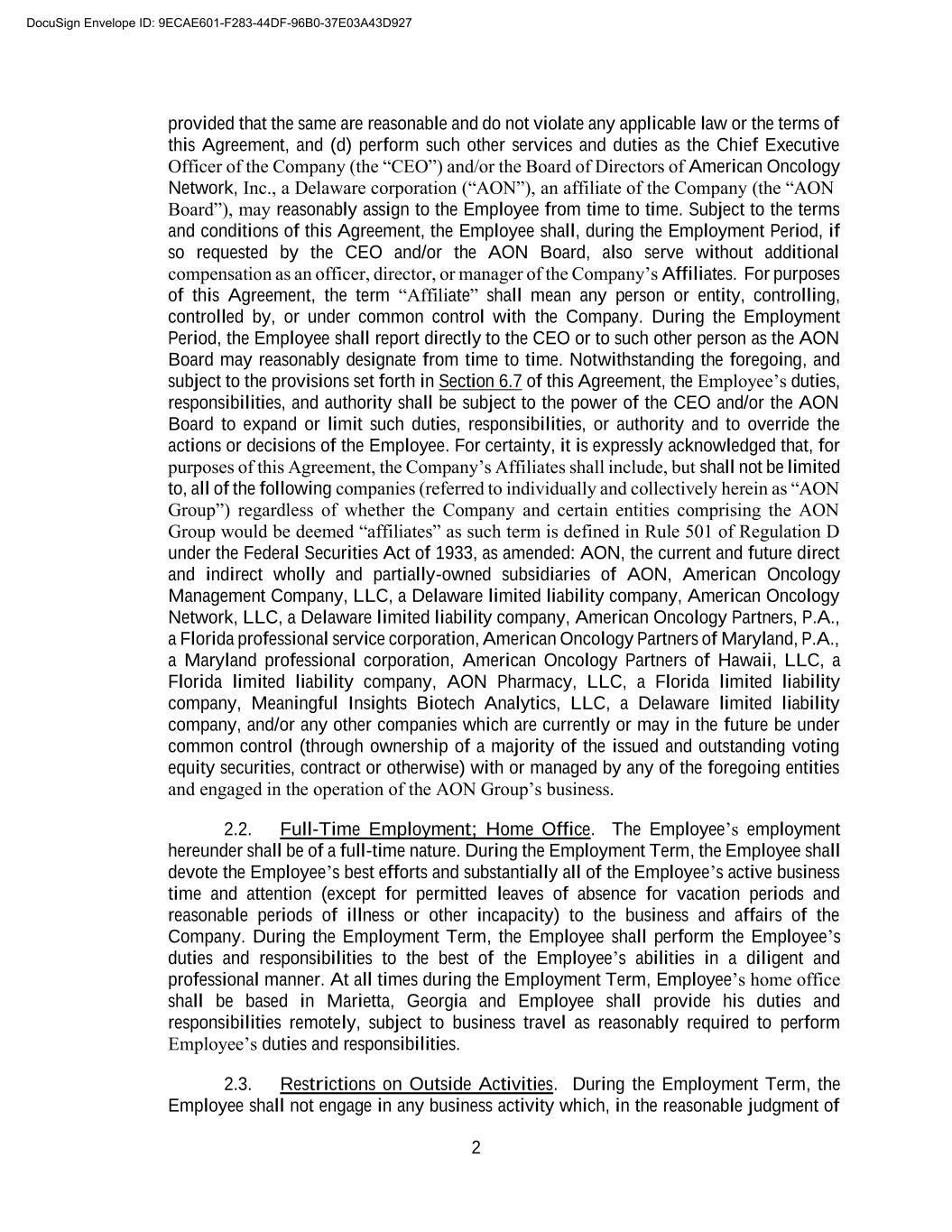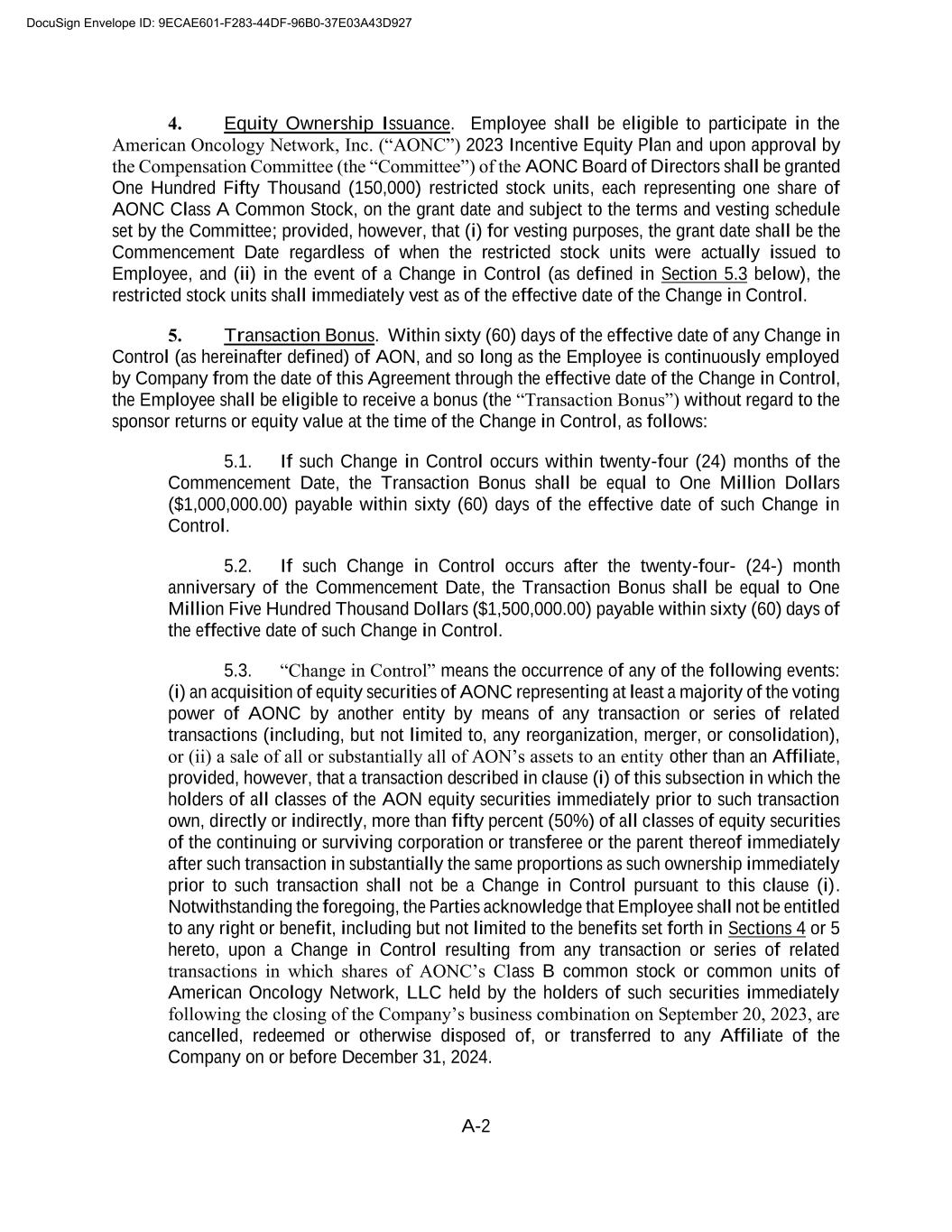 A-2 4. Equity Ownership Issuance. Employee shall be eligible to participate in the American Oncology Network, Inc. (“AONC”) 2023 Incentive Equity Plan and upon approval by the Compensation Committee (the “Committee”) of the AONC Board of Directors shall be granted One Hundred Fifty Thousand (150,000) restricted stock units, each representing one share of AONC Class A Common Stock, on the grant date and subject to the terms and vesting schedule set by the Committee; provided, however, that (i) for vesting purposes, the grant date shall be the Commencement Date regardless of when the restricted stock units were actually issued to Employee, and (ii) in the event of a Change in Control (as defined in Section 5.3 below), the restricted stock units shall immediately vest as of the effective date of the Change in Control. 5. Transaction Bonus. Within sixty (60) days of the effective date of any Change in Control (as hereinafter defined) of AON, and so long as the Employee is continuously employed by Company from the date of this Agreement through the effective date of the Change in Control, the Employee shall be eligible to receive a bonus (the “Transaction Bonus”) without regard to the sponsor returns or equity value at the time of the Change in Control, as follows: 5.1. If such Change in Control occurs within twenty-four (24) months of the Commencement Date, the Transaction Bonus shall be equal to One Million Dollars ($1,000,000.00) payable within sixty (60) days of the effective date of such Change in Control. 5.2. If such Change in Control occurs after the twenty-four- (24-) month anniversary of the Commencement Date, the Transaction Bonus shall be equal to One Million Five Hundred Thousand Dollars ($1,500,000.00) payable within sixty (60) days of the effective date of such Change in Control. 5.3. “Change in Control” means the occurrence of any of the following events: (i) an acquisition of equity securities of AONC representing at least a majority of the voting power of AONC by another entity by means of any transaction or series of related transactions (including, but not limited to, any reorganization, merger, or consolidation), or (ii) a sale of all or substantially all of AON’s assets to an entity other than an Affiliate, provided, however, that a transaction described in clause (i) of this subsection in which the holders of all classes of the AON equity securities immediately prior to such transaction own, directly or indirectly, more than fifty percent (50%) of all classes of equity securities of the continuing or surviving corporation or transferee or the parent thereof immediately after such transaction in substantially the same proportions as such ownership immediately prior to such transaction shall not be a Change in Control pursuant to this clause (i). Notwithstanding the foregoing, the Parties acknowledge that Employee shall not be entitled to any right or benefit, including but not limited to the benefits set forth in Sections 4 or 5 hereto, upon a Change in Control resulting from any transaction or series of related transactions in which shares of AONC’s Class B common stock or common units of American Oncology Network, LLC held by the holders of such securities immediately following the closing of the Company’s business combination on September 20, 2023, are cancelled, redeemed or otherwise disposed of, or transferred to any Affiliate of the Company on or before December 31, 2024. DocuSign Envelope ID: 9ECAE601-F283-44DF-96B0-37E03A43D927