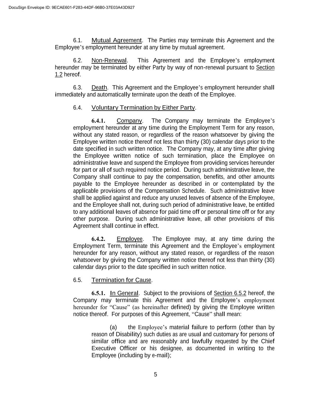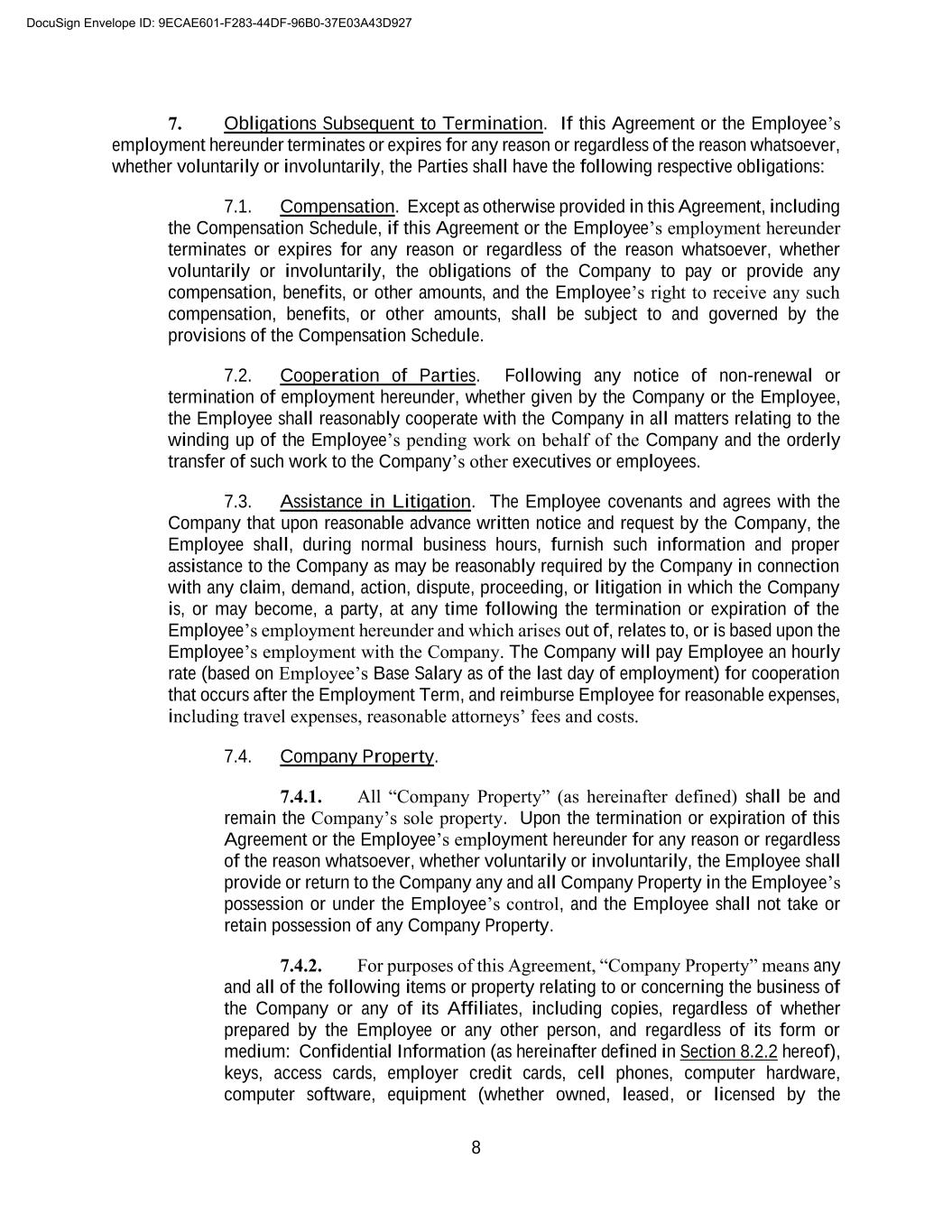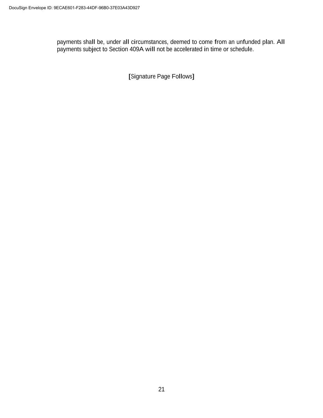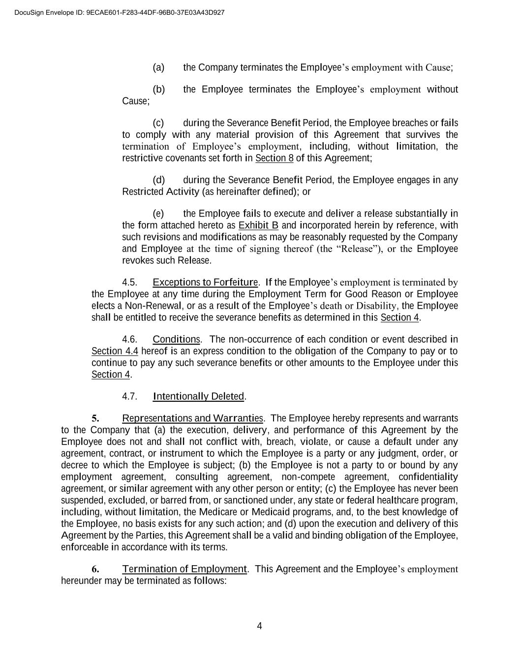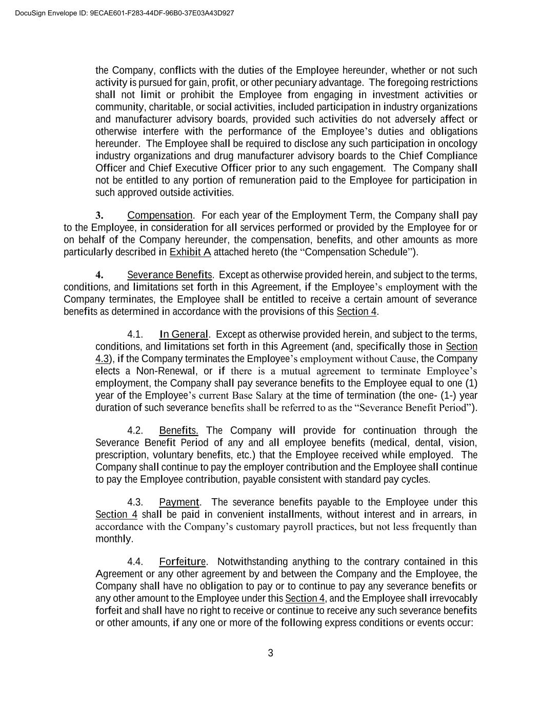 A-4 Company will pay the following to the Employee: (a) the accrued, but unpaid portion of the Base Salary payable (if any) to the Employee hereunder and (b) the Employee’s accrued, but unpaid or unused PTO, in each case prorated through the Employee’s effective date of termination or expiration of employment. Such amounts will be paid to the Employee as soon as administratively reasonable after such effective date of termination or expiration. Except as otherwise provided in this Compensation Schedule, any Base Salary, bonus, PTO benefits, or other amounts that would have accrued subsequent to such effective date of termination or expiration will abate. DocuSign Envelope ID: 9ECAE601-F283-44DF-96B0-37E03A43D927