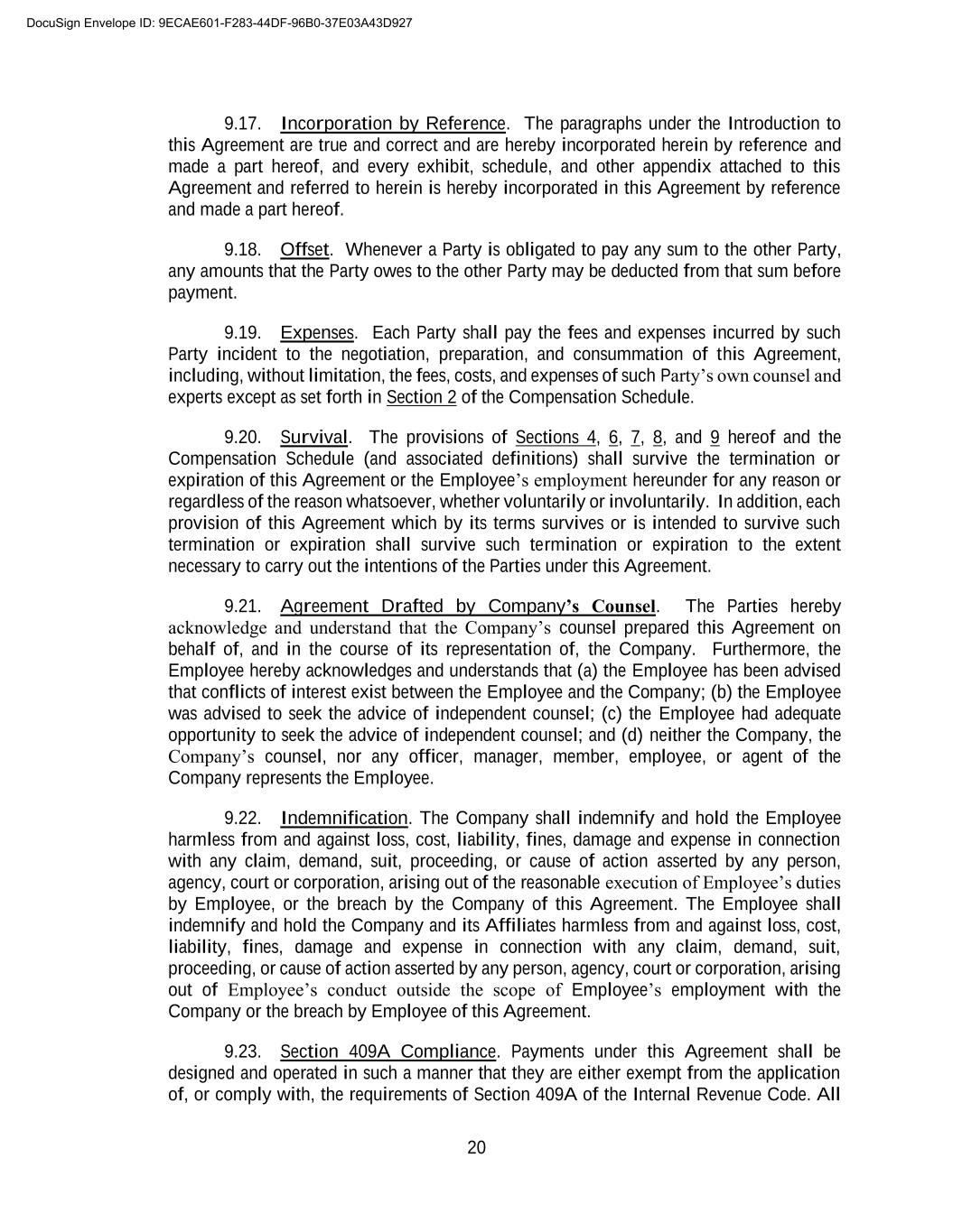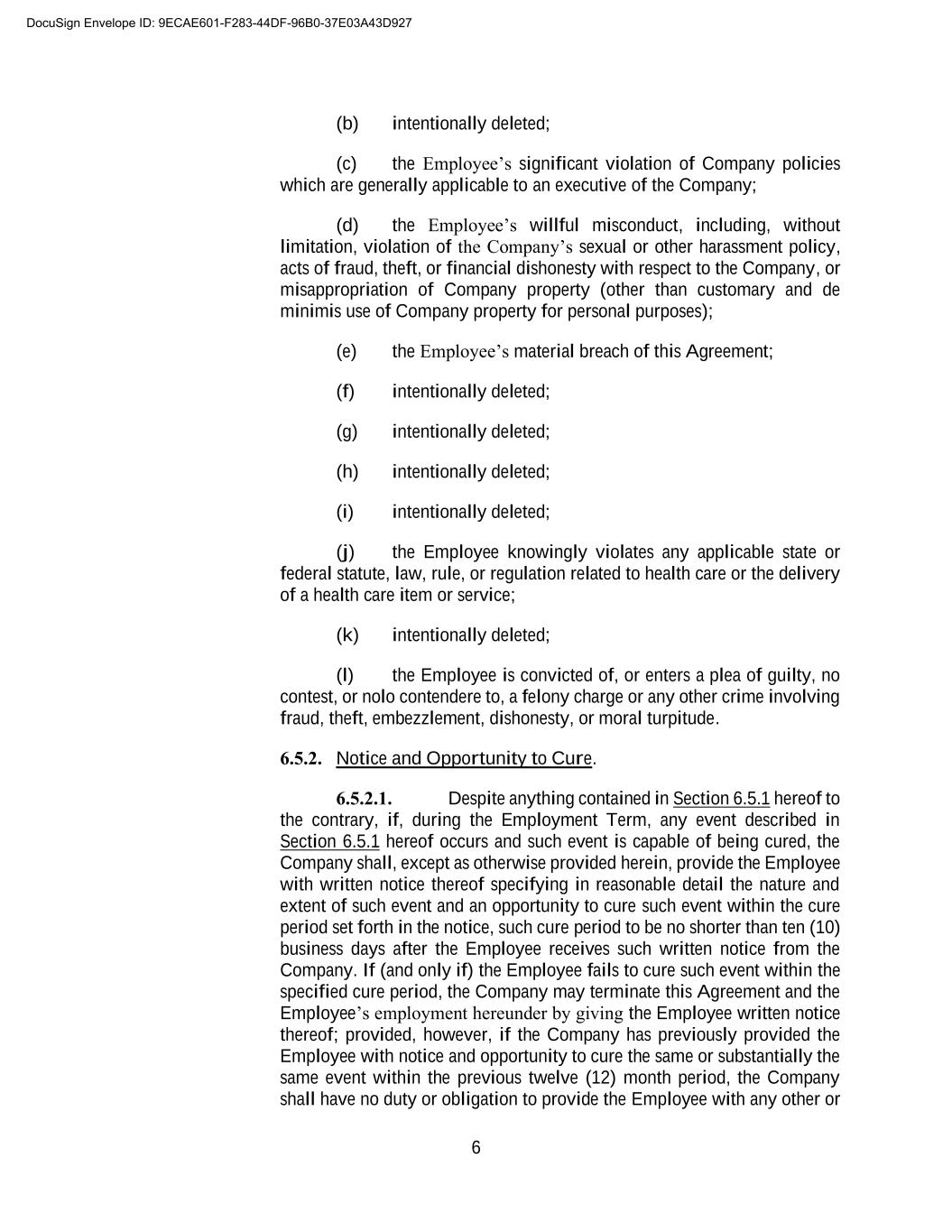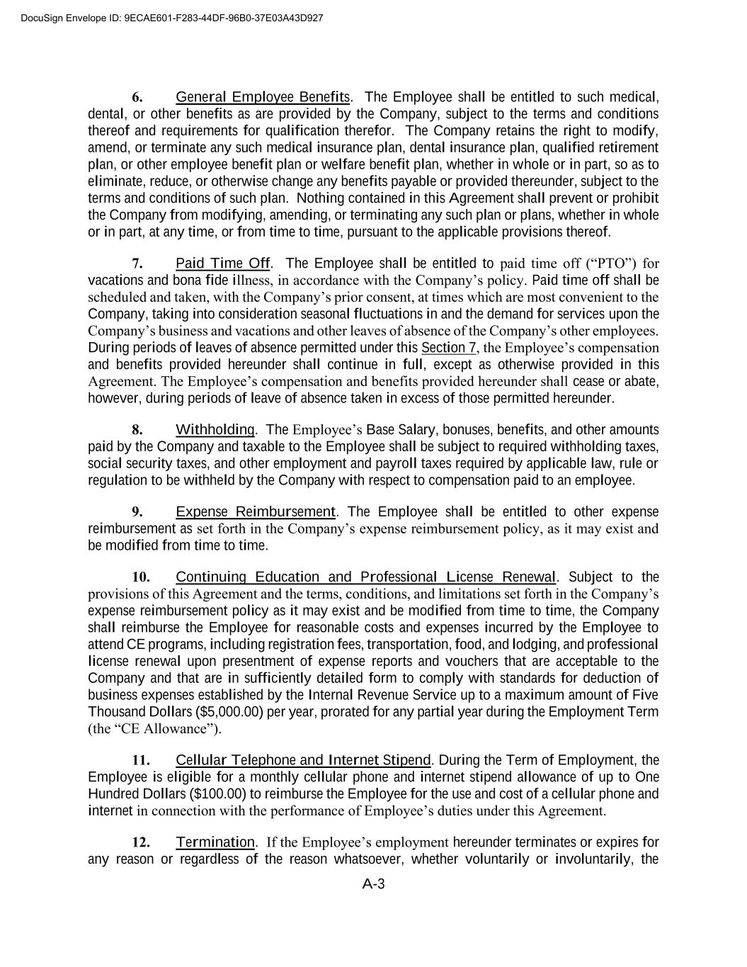 A-3 6. General Employee Benefits. The Employee shall be entitled to such medical, dental, or other benefits as are provided by the Company, subject to the terms and conditions thereof and requirements for qualification therefor. The Company retains the right to modify, amend, or terminate any such medical insurance plan, dental insurance plan, qualified retirement plan, or other employee benefit plan or welfare benefit plan, whether in whole or in part, so as to eliminate, reduce, or otherwise change any benefits payable or provided thereunder, subject to the terms and conditions of such plan. Nothing contained in this Agreement shall prevent or prohibit the Company from modifying, amending, or terminating any such plan or plans, whether in whole or in part, at any time, or from time to time, pursuant to the applicable provisions thereof. 7. Paid Time Off. The Employee shall be entitled to paid time off (“PTO”) for vacations and bona fide illness, in accordance with the Company’s policy. Paid time off shall be scheduled and taken, with the Company’s prior consent, at times which are most convenient to the Company, taking into consideration seasonal fluctuations in and the demand for services upon the Company’s business and vacations and other leaves of absence of the Company’s other employees. During periods of leaves of absence permitted under this Section 7, the Employee’s compensation and benefits provided hereunder shall continue in full, except as otherwise provided in this Agreement. The Employee’s compensation and benefits provided hereunder shall cease or abate, however, during periods of leave of absence taken in excess of those permitted hereunder. 8. Withholding. The Employee’s Base Salary, bonuses, benefits, and other amounts paid by the Company and taxable to the Employee shall be subject to required withholding taxes, social security taxes, and other employment and payroll taxes required by applicable law, rule or regulation to be withheld by the Company with respect to compensation paid to an employee. 9. Expense Reimbursement. The Employee shall be entitled to other expense reimbursement as set forth in the Company’s expense reimbursement policy, as it may exist and be modified from time to time. 10. Continuing Education and Professional License Renewal. Subject to the provisions of this Agreement and the terms, conditions, and limitations set forth in the Company’s expense reimbursement policy as it may exist and be modified from time to time, the Company shall reimburse the Employee for reasonable costs and expenses incurred by the Employee to attend CE programs, including registration fees, transportation, food, and lodging, and professional license renewal upon presentment of expense reports and vouchers that are acceptable to the Company and that are in sufficiently detailed form to comply with standards for deduction of business expenses established by the Internal Revenue Service up to a maximum amount of Five Thousand Dollars ($5,000.00) per year, prorated for any partial year during the Employment Term (the “CE Allowance”). 11. Cellular Telephone and Internet Stipend. During the Term of Employment, the Employee is eligible for a monthly cellular phone and internet stipend allowance of up to One Hundred Dollars ($100.00) to reimburse the Employee for the use and cost of a cellular phone and internet in connection with the performance of Employee’s duties under this Agreement. 12. Termination. If the Employee’s employment hereunder terminates or expires for any reason or regardless of the reason whatsoever, whether voluntarily or involuntarily, the DocuSign Envelope ID: 9ECAE601-F283-44DF-96B0-37E03A43D927