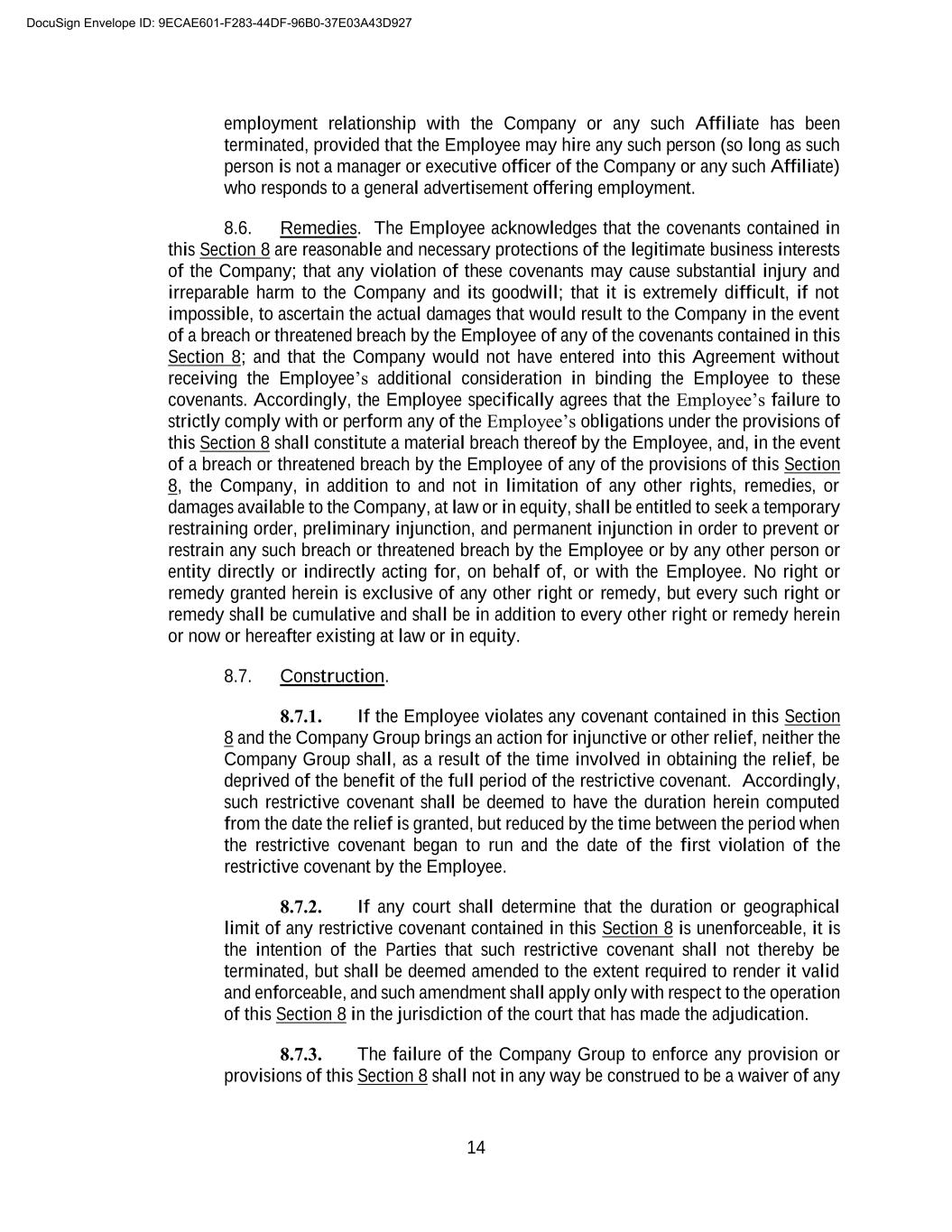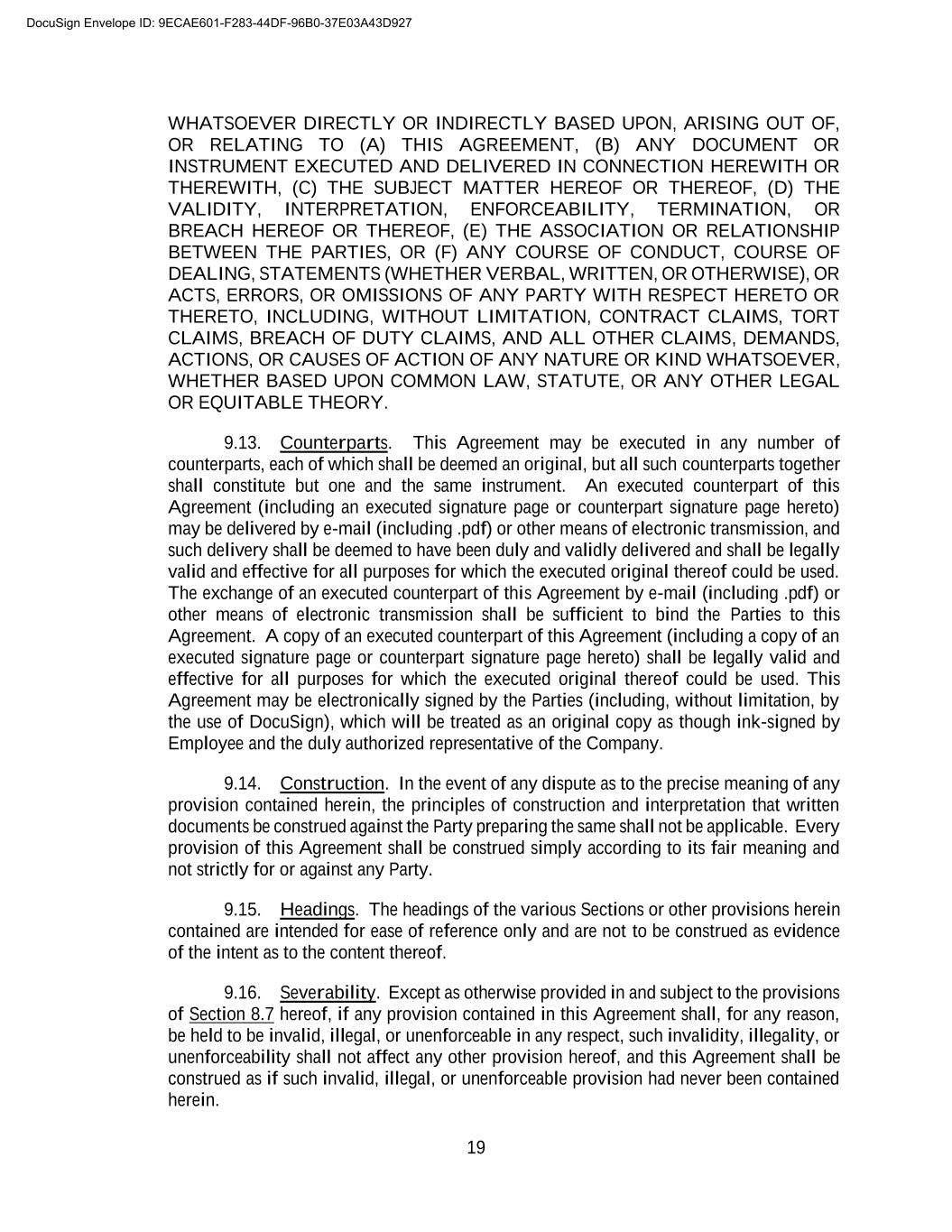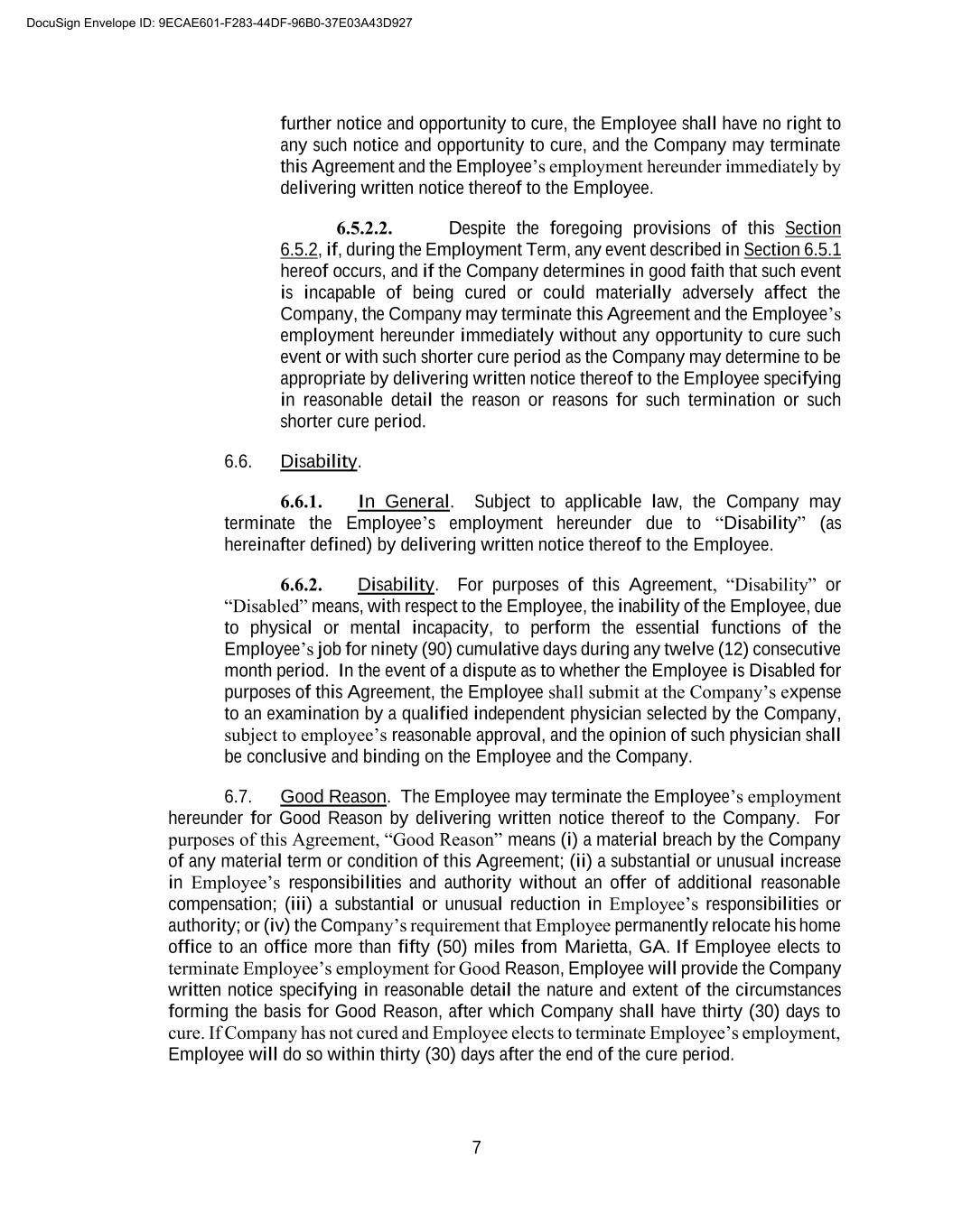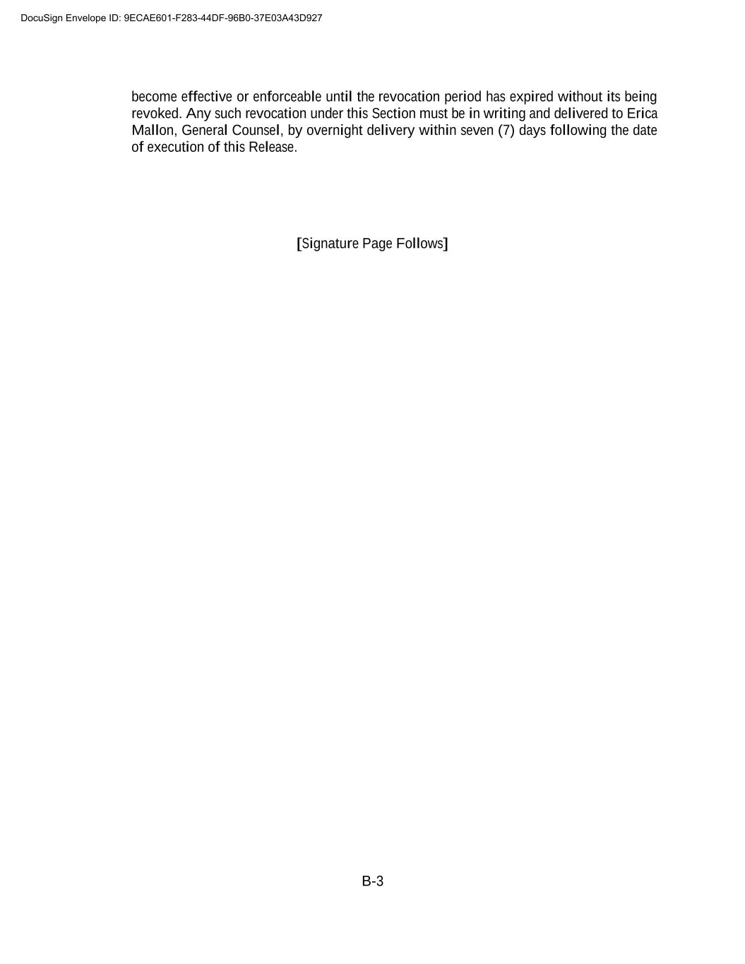 B-3 become effective or enforceable until the revocation period has expired without its being revoked. Any such revocation under this Section must be in writing and delivered to Erica Mallon, General Counsel, by overnight delivery within seven (7) days following the date of execution of this Release. [Signature Page Follows] DocuSign Envelope ID: 9ECAE601-F283-44DF-96B0-37E03A43D927