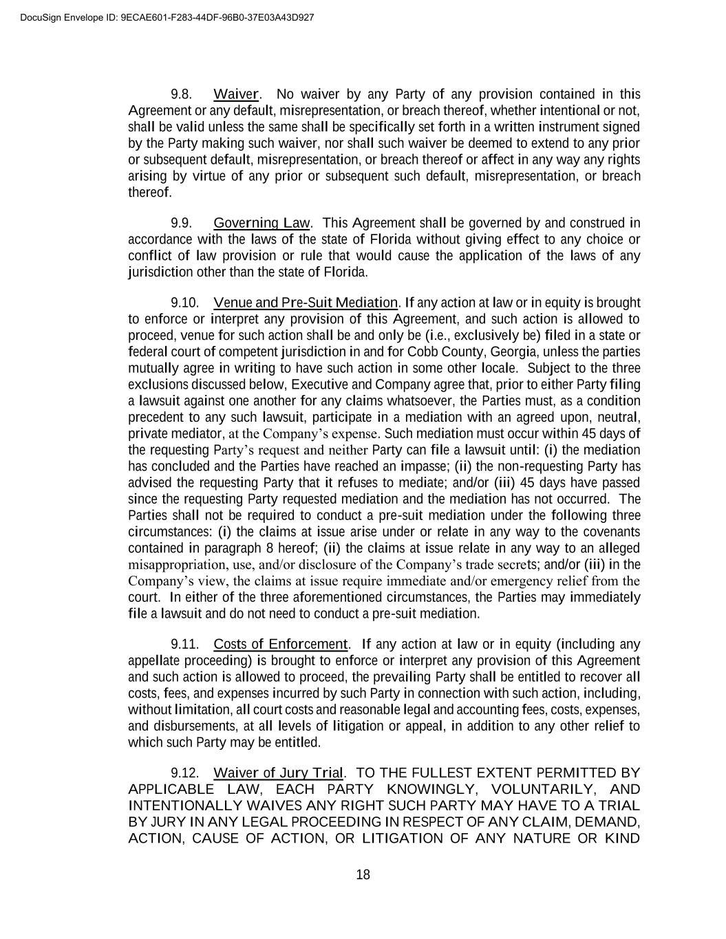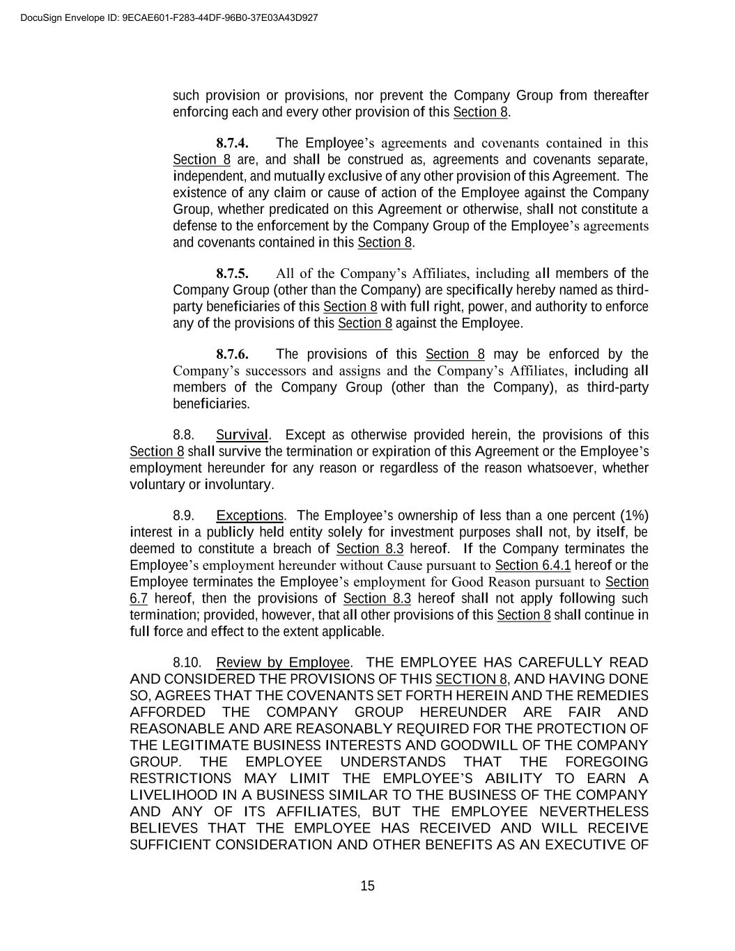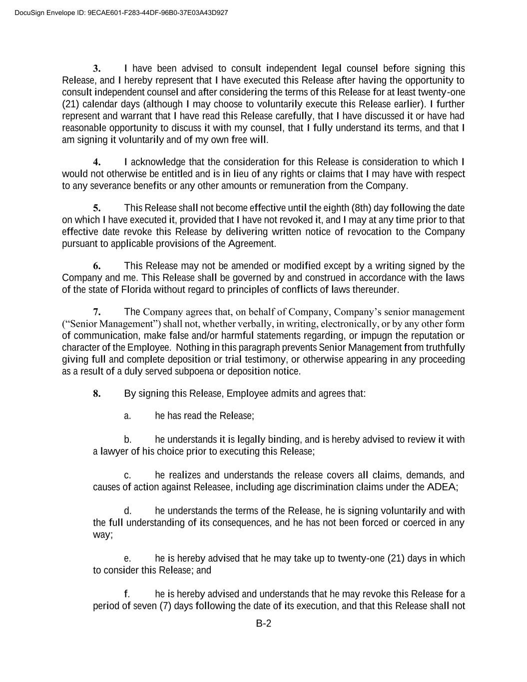 B-2 3. I have been advised to consult independent legal counsel before signing this Release, and I hereby represent that I have executed this Release after having the opportunity to consult independent counsel and after considering the terms of this Release for at least twenty-one (21) calendar days (although I may choose to voluntarily execute this Release earlier). I further represent and warrant that I have read this Release carefully, that I have discussed it or have had reasonable opportunity to discuss it with my counsel, that I fully understand its terms, and that I am signing it voluntarily and of my own free will. 4. I acknowledge that the consideration for this Release is consideration to which I would not otherwise be entitled and is in lieu of any rights or claims that I may have with respect to any severance benefits or any other amounts or remuneration from the Company. 5. This Release shall not become effective until the eighth (8th) day following the date on which I have executed it, provided that I have not revoked it, and I may at any time prior to that effective date revoke this Release by delivering written notice of revocation to the Company pursuant to applicable provisions of the Agreement. 6. This Release may not be amended or modified except by a writing signed by the Company and me. This Release shall be governed by and construed in accordance with the laws of the state of Florida without regard to principles of conflicts of laws thereunder. 7. The Company agrees that, on behalf of Company, Company’s senior management (“Senior Management”) shall not, whether verbally, in writing, electronically, or by any other form of communication, make false and/or harmful statements regarding, or impugn the reputation or character of the Employee. Nothing in this paragraph prevents Senior Management from truthfully giving full and complete deposition or trial testimony, or otherwise appearing in any proceeding as a result of a duly served subpoena or deposition notice. 8. By signing this Release, Employee admits and agrees that: a. he has read the Release; b. he understands it is legally binding, and is hereby advised to review it with a lawyer of his choice prior to executing this Release; c. he realizes and understands the release covers all claims, demands, and causes of action against Releasee, including age discrimination claims under the ADEA; d. he understands the terms of the Release, he is signing voluntarily and with the full understanding of its consequences, and he has not been forced or coerced in any way; e. he is hereby advised that he may take up to twenty-one (21) days in which to consider this Release; and f. he is hereby advised and understands that he may revoke this Release for a period of seven (7) days following the date of its execution, and that this Release shall not DocuSign Envelope ID: 9ECAE601-F283-44DF-96B0-37E03A43D927
