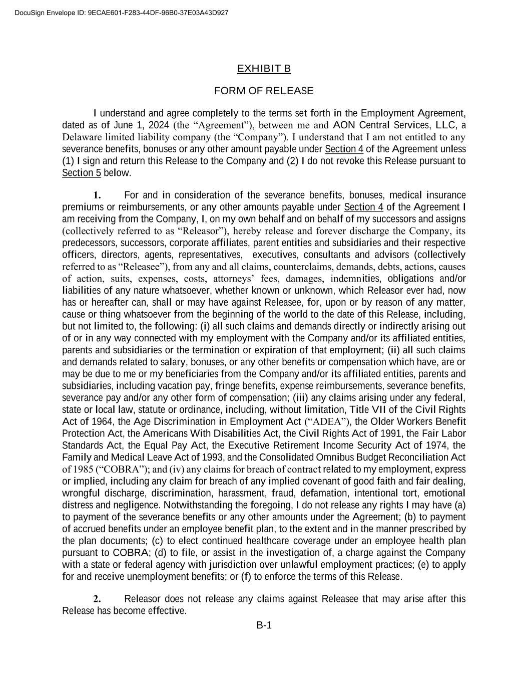 B-1 EXHIBIT B FORM OF RELEASE I understand and agree completely to the terms set forth in the Employment Agreement, dated as of June 1, 2024 (the “Agreement”), between me and AON Central Services, LLC, a Delaware limited liability company (the “Company”). I understand that I am not entitled to any severance benefits, bonuses or any other amount payable under Section 4 of the Agreement unless (1) I sign and return this Release to the Company and (2) I do not revoke this Release pursuant to Section 5 below. 1. For and in consideration of the severance benefits, bonuses, medical insurance premiums or reimbursements, or any other amounts payable under Section 4 of the Agreement I am receiving from the Company, I, on my own behalf and on behalf of my successors and assigns (collectively referred to as “Releasor”), hereby release and forever discharge the Company, its predecessors, successors, corporate affiliates, parent entities and subsidiaries and their respective officers, directors, agents, representatives, executives, consultants and advisors (collectively referred to as “Releasee”), from any and all claims, counterclaims, demands, debts, actions, causes of action, suits, expenses, costs, attorneys’ fees, damages, indemnities, obligations and/or liabilities of any nature whatsoever, whether known or unknown, which Releasor ever had, now has or hereafter can, shall or may have against Releasee, for, upon or by reason of any matter, cause or thing whatsoever from the beginning of the world to the date of this Release, including, but not limited to, the following: (i) all such claims and demands directly or indirectly arising out of or in any way connected with my employment with the Company and/or its affiliated entities, parents and subsidiaries or the termination or expiration of that employment; (ii) all such claims and demands related to salary, bonuses, or any other benefits or compensation which have, are or may be due to me or my beneficiaries from the Company and/or its affiliated entities, parents and subsidiaries, including vacation pay, fringe benefits, expense reimbursements, severance benefits, severance pay and/or any other form of compensation; (iii) any claims arising under any federal, state or local law, statute or ordinance, including, without limitation, Title VII of the Civil Rights Act of 1964, the Age Discrimination in Employment Act (“ADEA”), the Older Workers Benefit Protection Act, the Americans With Disabilities Act, the Civil Rights Act of 1991, the Fair Labor Standards Act, the Equal Pay Act, the Executive Retirement Income Security Act of 1974, the Family and Medical Leave Act of 1993, and the Consolidated Omnibus Budget Reconciliation Act of 1985 (“COBRA”); and (iv) any claims for breach of contract related to my employment, express or implied, including any claim for breach of any implied covenant of good faith and fair dealing, wrongful discharge, discrimination, harassment, fraud, defamation, intentional tort, emotional distress and negligence. Notwithstanding the foregoing, I do not release any rights I may have (a) to payment of the severance benefits or any other amounts under the Agreement; (b) to payment of accrued benefits under an employee benefit plan, to the extent and in the manner prescribed by the plan documents; (c) to elect continued healthcare coverage under an employee health plan pursuant to COBRA; (d) to file, or assist in the investigation of, a charge against the Company with a state or federal agency with jurisdiction over unlawful employment practices; (e) to apply for and receive unemployment benefits; or (f) to enforce the terms of this Release. 2. Releasor does not release any claims against Releasee that may arise after this Release has become effective. DocuSign Envelope ID: 9ECAE601-F283-44DF-96B0-37E03A43D927