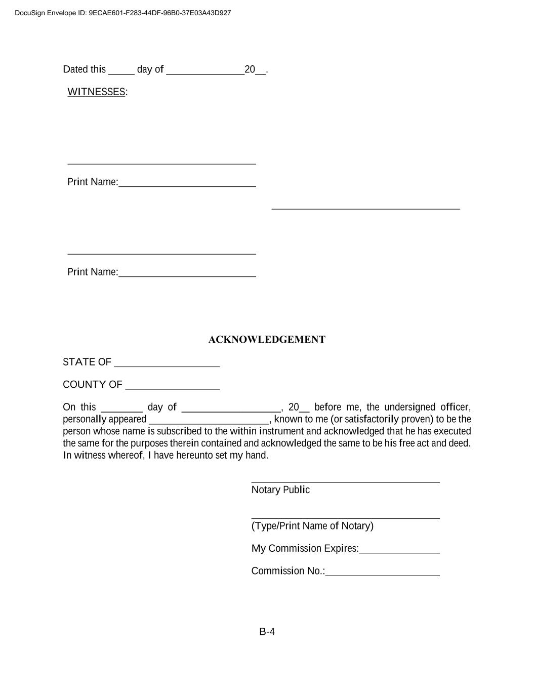 B-4 Dated this _____ day of _______________20__. WITNESSES: Print Name: Print Name: ACKNOWLEDGEMENT STATE OF COUNTY OF On this ________ day of ___________________, 20__ before me, the undersigned officer, personally appeared _______________________, known to me (or satisfactorily proven) to be the person whose name is subscribed to the within instrument and acknowledged that he has executed the same for the purposes therein contained and acknowledged the same to be his free act and deed. In witness whereof, I have hereunto set my hand. Notary Public (Type/Print Name of Notary) My Commission Expires: Commission No.: DocuSign Envelope ID: 9ECAE601-F283-44DF-96B0-37E03A43D927